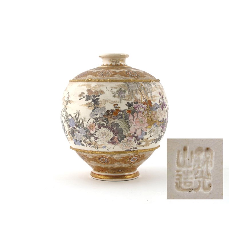 A Japanese Satsuma ovoid vase by Kinkozan c.1900, delicately painted with flowers overflowing from a gilded basket, all in a wide band between stylized borders, the base with an impressed mark, a little wear to the rim, 18cm.