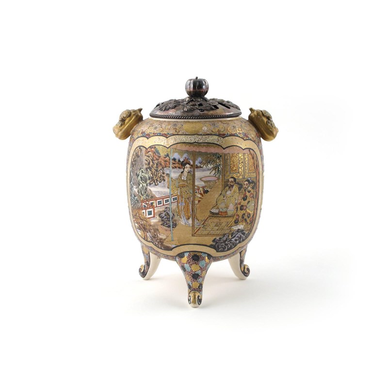 A Japanese Satsuma koro and cover c.1900, with fruit handles, painted with two large panels of figures in landscapes, the silver lid a replacement, 26cm. (2)