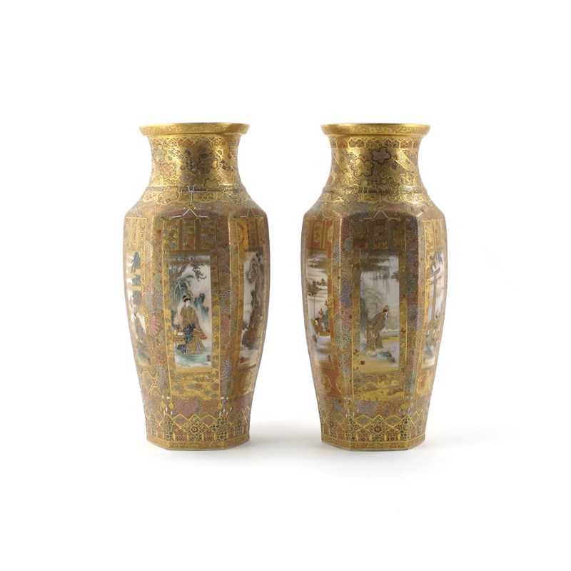 A large and rare pair of Japanese Satsuma Kinkozan vases c.1900, the hexagonal bodies painted with panels of figures, the ground elaborately painted with chrysanthemum and brocade designs, variously signed Sozan, Okahashi and Fuzan (?), 36cm. (2)