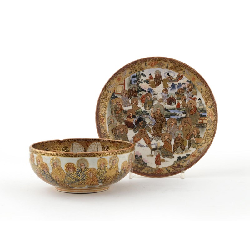 A Japanese Satsuma bowl and plate c.1900, each decorated with many figures, signed in gilt, 18.8cm max. (2)