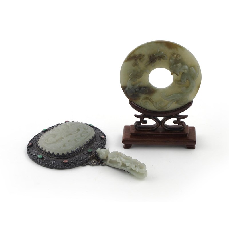 A Chinese jade mounted hand mirror formed from a belt buckle and an oval plaque carved with a dragon, together with a jade bi disc carved with three dragons, 20.5cm. (3)