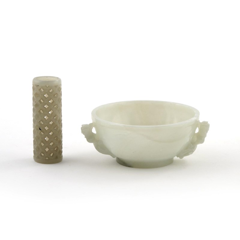 A Chinese celadon jade bowl, carved with dragon handles, and a reticulated celadon jade cylinder, 11.5cm. (2)