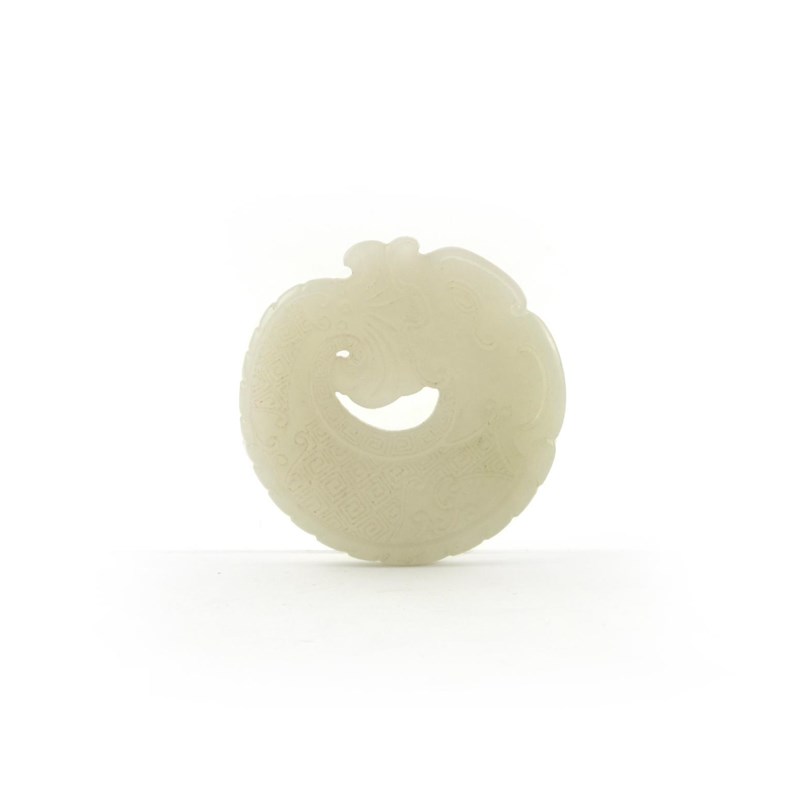 A Chinese white jade plaque, carved as a fish with its tail in its mouth, 5.5cm.