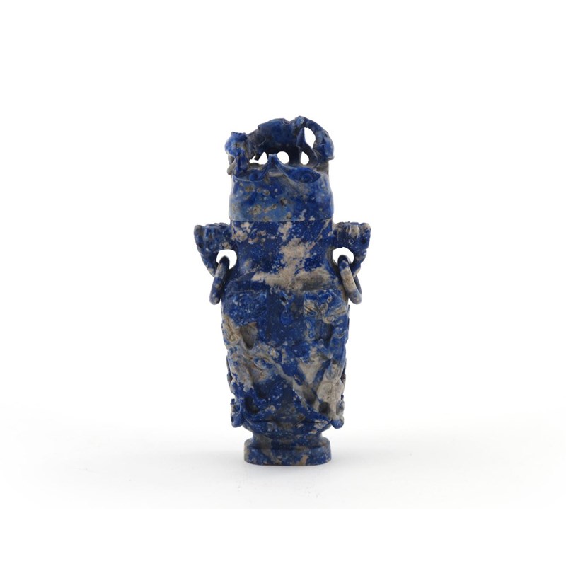 A Chinese lapis lazuli vase and cover 19th century, carved with stylized dragons and with loose ring handles, the cover damaged, 14.5cm. (2)