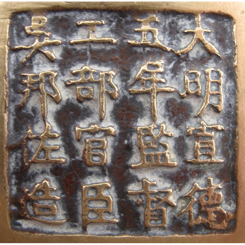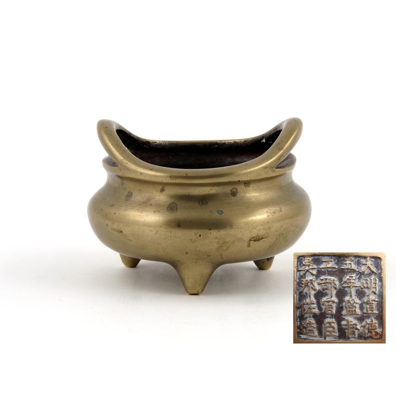 A Chinese polished bronze tripod censer 19th century, the base with a sixteen character mark, 14cm.