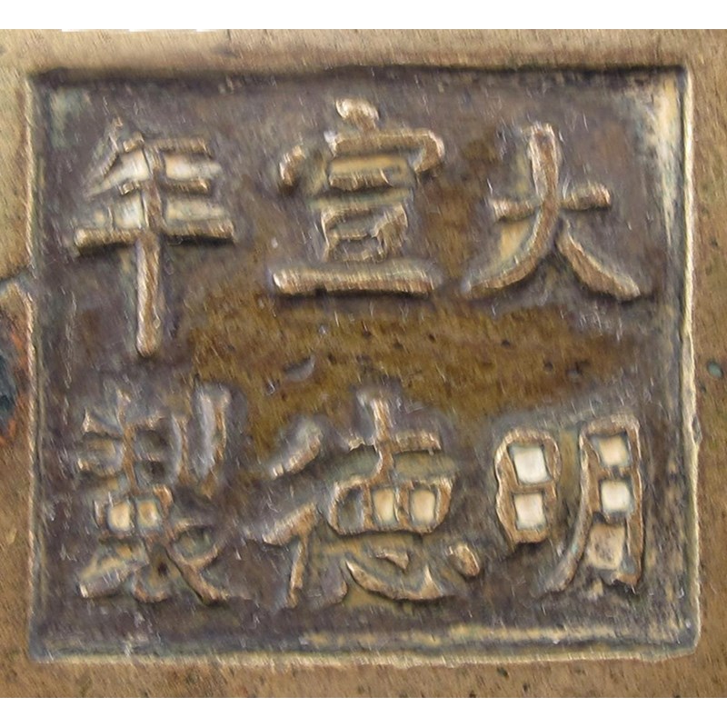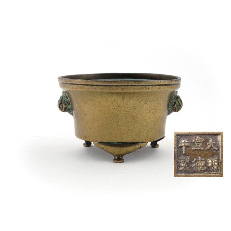 A small Chinese bronze tripod censer 19th century, with lion mask handles and a six character Xuande mark to the base, dents to the sides, 10cm.