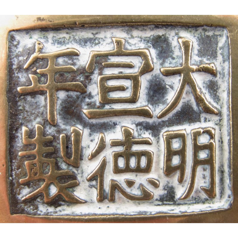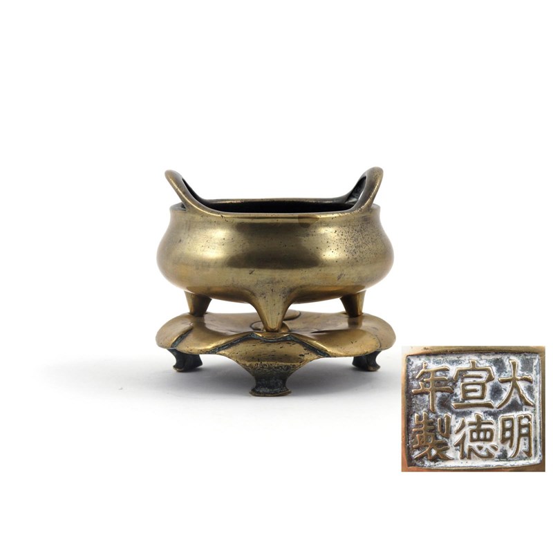 A Chinese polished bronze tripod censer and stand 19th century, six character Xuande mark, wear and dents, and a crack to one handle, 11cm. (2)