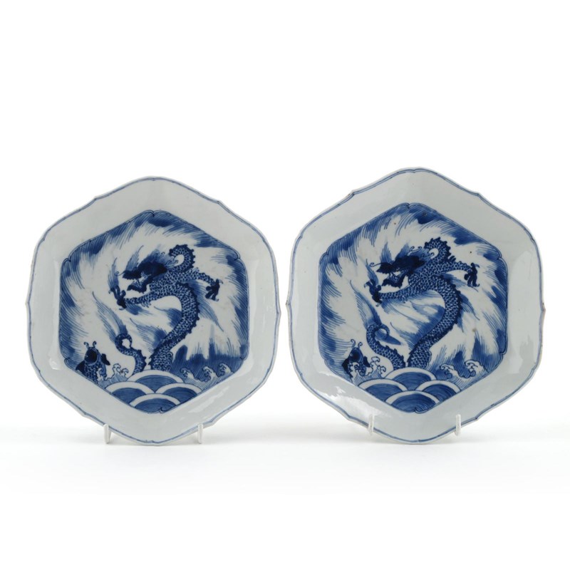 A pair of Chinese blue and white hexagonal dishes Kangxi 1662-1722, each depicting a scaly ferocious dragon with a fish amidst waves and clouds, each with a ding mark, 21.6cm. (2)