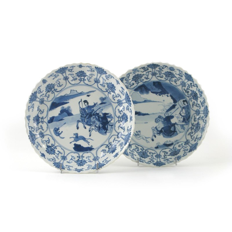 A pair of Chinese blue and white moulded dishes Kangxi 1662-1722, well painted with hunting scenes and with figures on horseback in rocky landscapes, the borders painted with stylized lotus, each with a six character Chenghua mark, 20cm. (2)