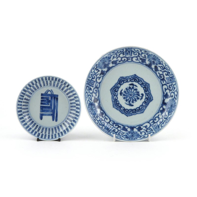 Two Chinese blue and white saucer dishes each with a Yongzheng mark and of the period 1723-35, one decorated with lanca, the other with flowers, scrolls and shou characters, 20cm. (2)