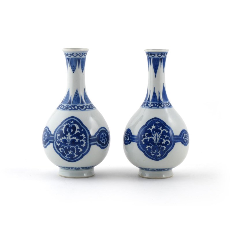 A pair of Chinese blue and white bottle vases Kangxi 1662-1722, each painted with three octafoil panels, enclosing scrolling foliage, the necks with bands of ruyi-heads and stylized petals, 19.5cm. (2)