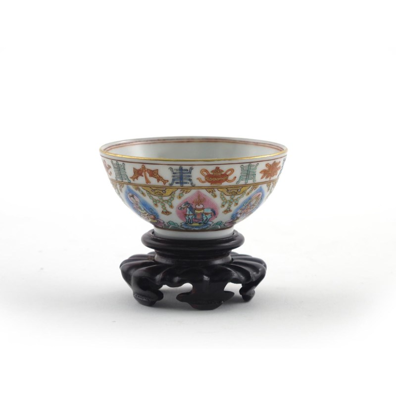 A Chinese famille rose 'Baragon Tumed' small bowl 19th century, decorated with the Seven Regal Treasures, the wheel of the law, elephant, horse, jewel, the Queen, the Minister and the General, all upon stylized waves and lotus blossoms, and beneath a band of Buddhist emblems and shou characters, the interior with a single lotus blossom, an iron red mark to the base, together with a wood stand, 7.1cm. (2)