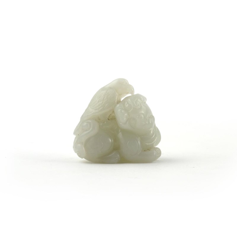 A Chinese white jade carving of a Buddhist lion dog, crouching with a bird of prey on its back, the dog with its head turned to dexter, 4.5cm.