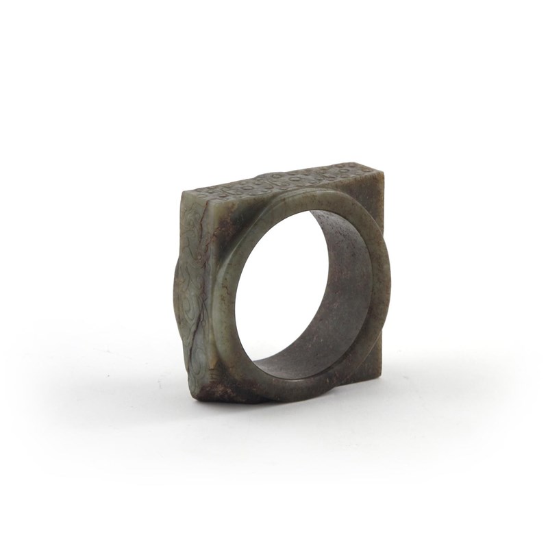 A Chinese celadon jade cong probably Western Zhou dynasty, of flattened form, carved with flowerheads and dragons, large chips to the rim and corners, 9.7cm.