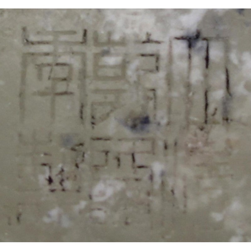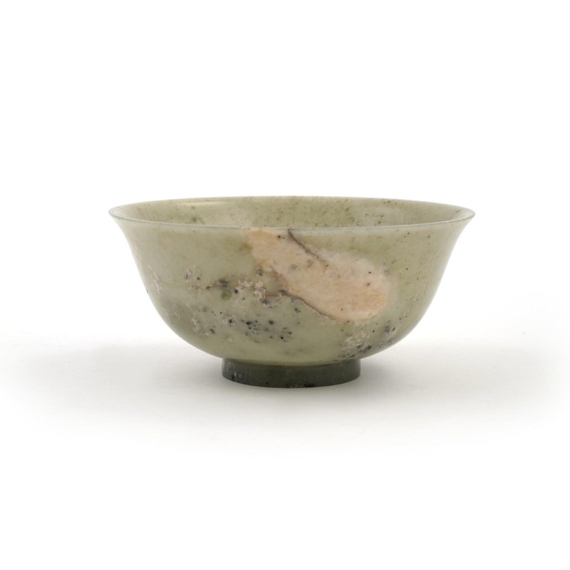 A Chinese celadon jade bowl Qianlong six character mark and of the period 1736-95, the bowl with a flared rim, raised on a neat square-section foot, the stone with grey and cream mottling and inclusions, small rim chips and faults to the stone, 15.5cm.
