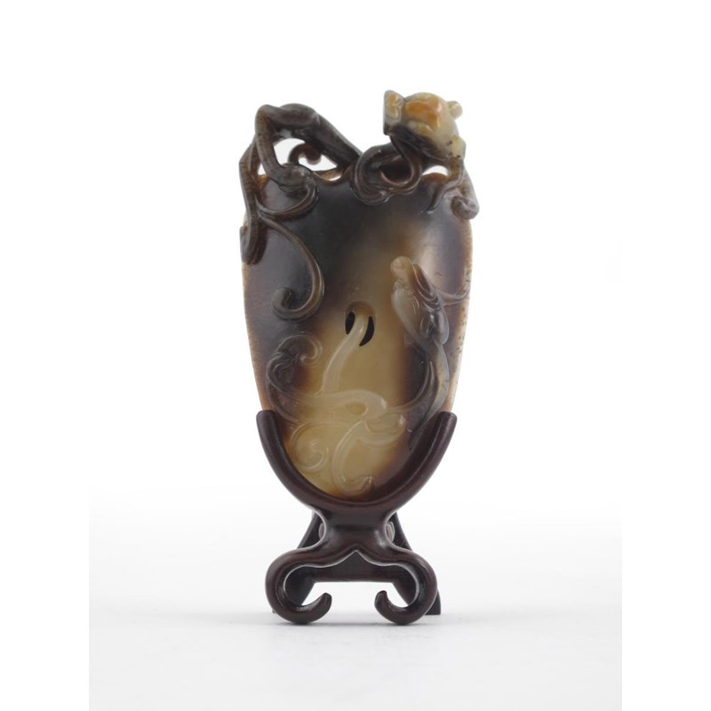 A Chinese jade leaf-shaped tray probably 19th century, carved with two sinuous dragons, the stone in tones of brown and honey, with a hardwood stand, 8.4cm. (2)