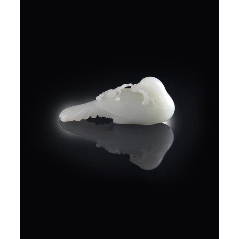 A fine Chinese white jade carving of a bird 18th century, crisply carved with its head turned over its back holding a flowering spray of prunus in its beak, the feathers finely defined, the legs and feet tucked neatly beneath the body, the stone of an even tone, 11.5cm.