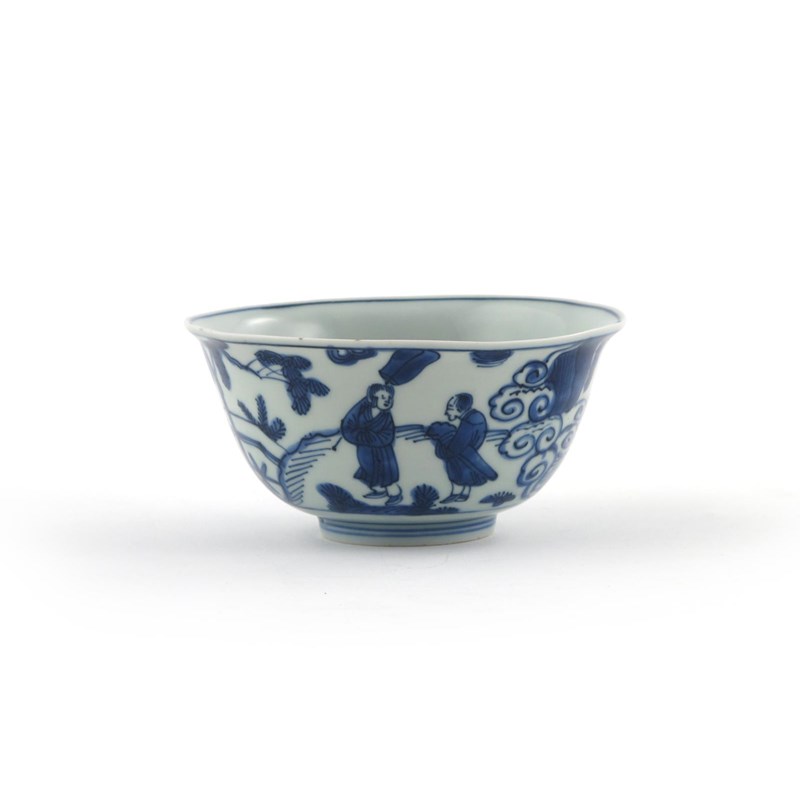 A good Chinese blue and white small bowl six character Jiajing mark and of the period 1522-66, painted with figures in a fenced garden amidst cloud scrolls and foliage, the interior with a figure in clouds, 12.1cm.
