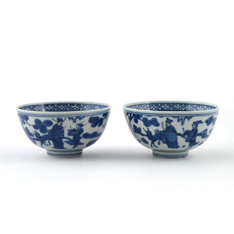 A pair of Chinese blue and white porcelain small bowls Wanli c.1580, both painted with scenes of a horse with its rider, dignitaries carrying hu tablets and a deer amidst trees, pagodas and rocks, the interior roundels each painted with a single figure in a fenced garden, below an inner rim of cross diaper, each base with a two character Zhen Yi mark, 11.8cm. (2)