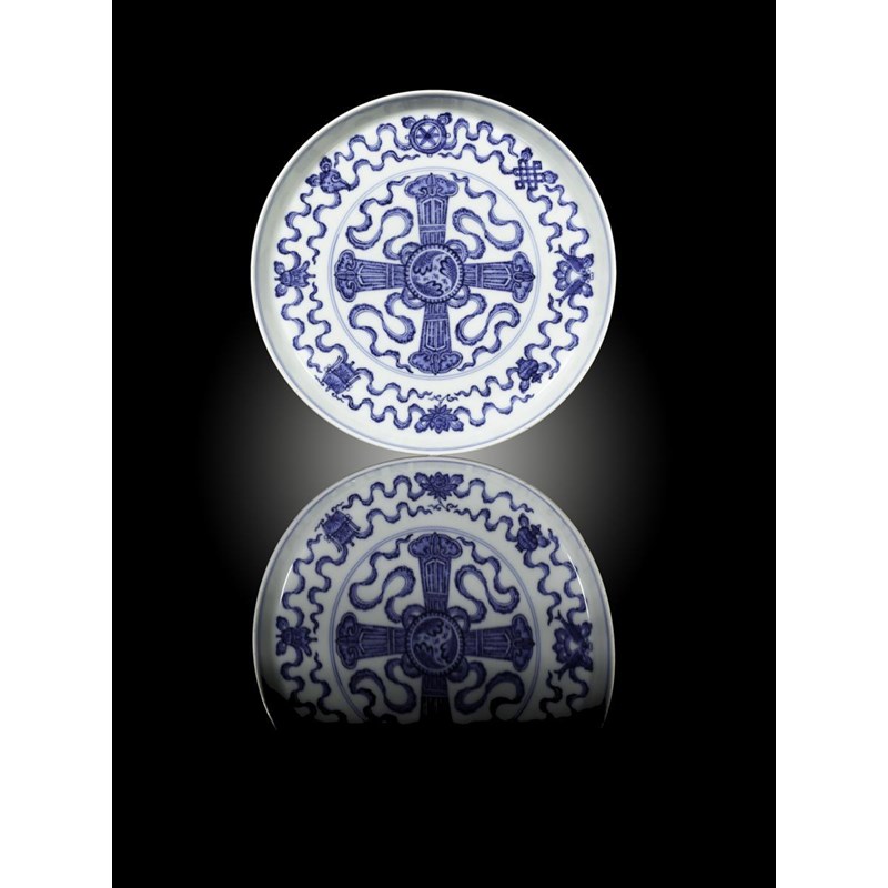 A Chinese blue and white low footed dish Qianlong seal mark and probably of the period, painted with the Eight Buddhist Emblems encircling a stylized cross motif, the reverse with a band of lappets, a key fret border, and flared foot, 20.8cm.
