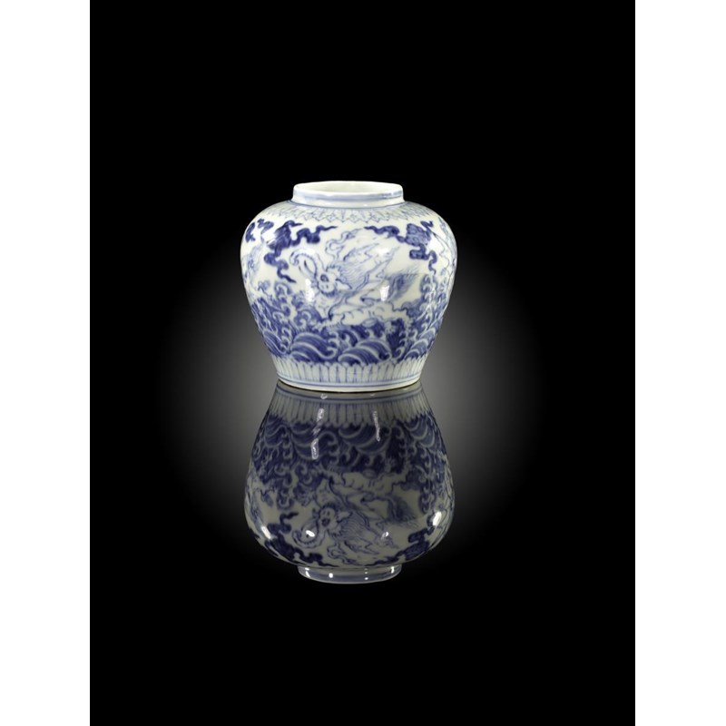 *A very rare Chinese porcelain baluster jar Chenghua 1465-87, painted with four fabulous mythological creatures with tusks, trunks and wings, above waves and between finely painted leaf bands to the shoulder and foot, the base with a tian (heaven) mark, extensively damaged and repaired, 11.5cm high, 12.8cm across.