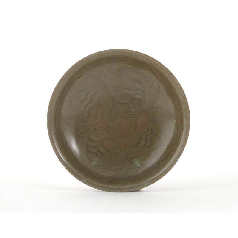 A Chinese shallow celadon glazed bowl Song dynasty, incised with a stylized scroll design, the base with two characters in black ink, 13.8cm.