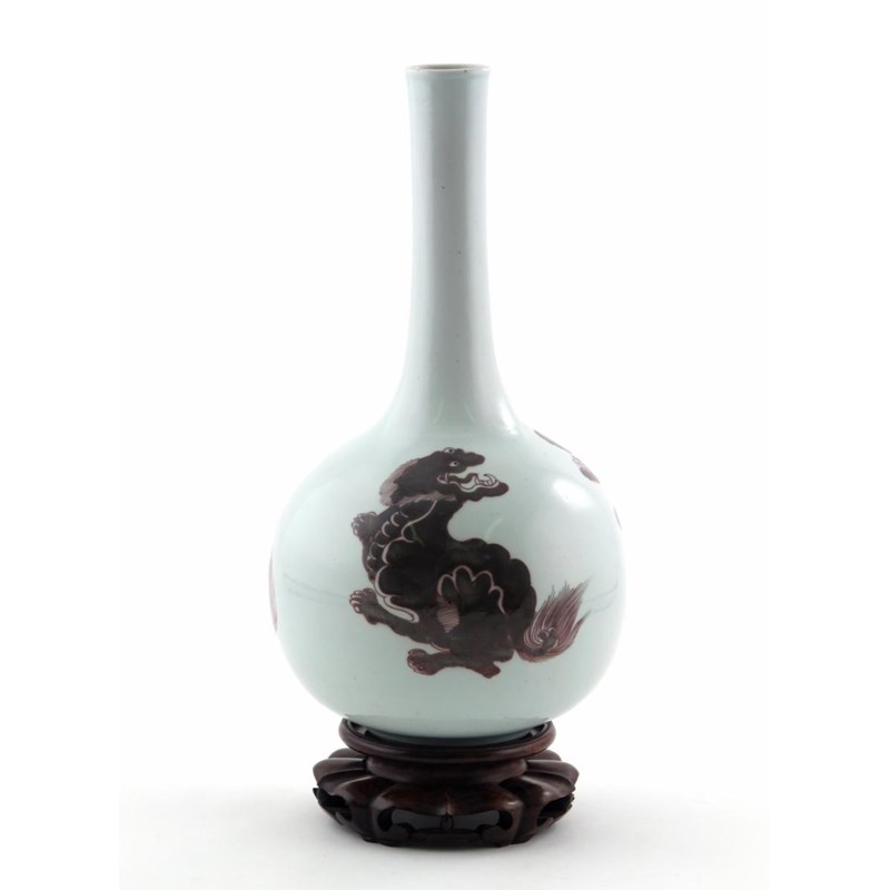 A Chinese bottle vase Kangxi 1662-1722, painted in underglaze copper-red with three Buddhist lion dogs crouching with their heads raised and baring their teeth, their eyes in underglaze blue, together with a wood stand, 38.5cm. (2)
