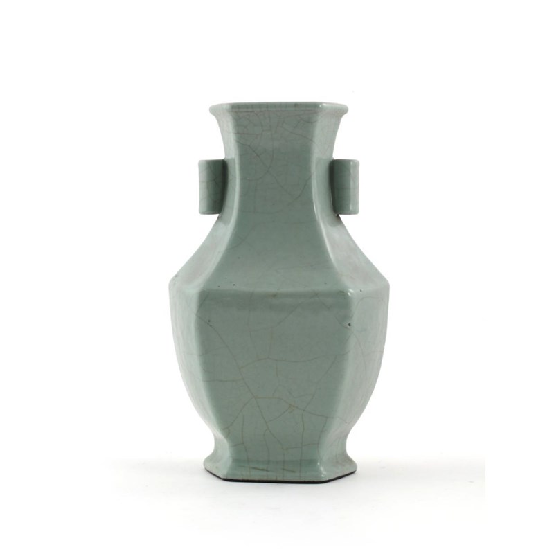 A Chinese ge-type hexagonal vase probably 18th century, the slightly flattened body decorated in a crackled celadon glaze, the neck applied with two cylinder handles, 36.5cm.