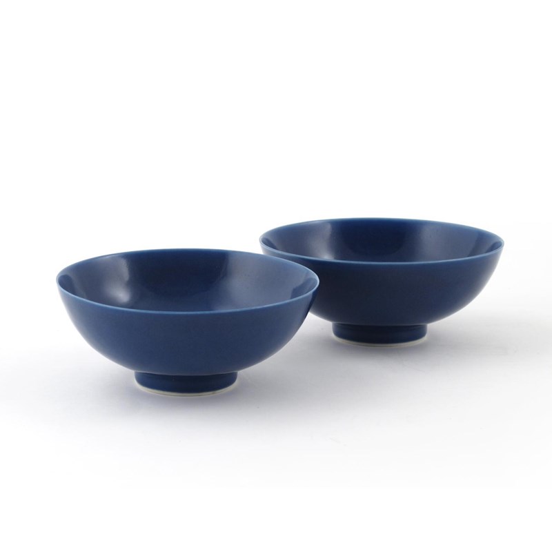 A pair of Chinese Imperial blue glazed deep bowls six character Guangxu marks and of the period 1875-1908, the bodies decorated with a rich even violet-blue glaze, the bases white, 17.3cm. (2)