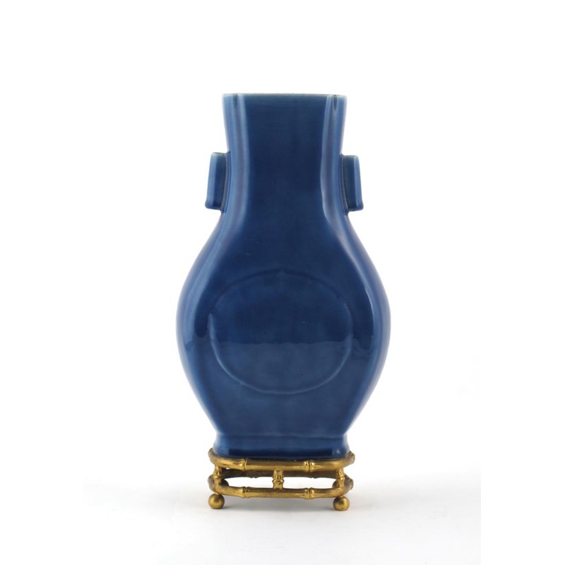A Chinese blue glazed vase fanghu six character Guangxu mark and probably of the period, glued to a simulated bamboo gilt metal stand, 39cm.