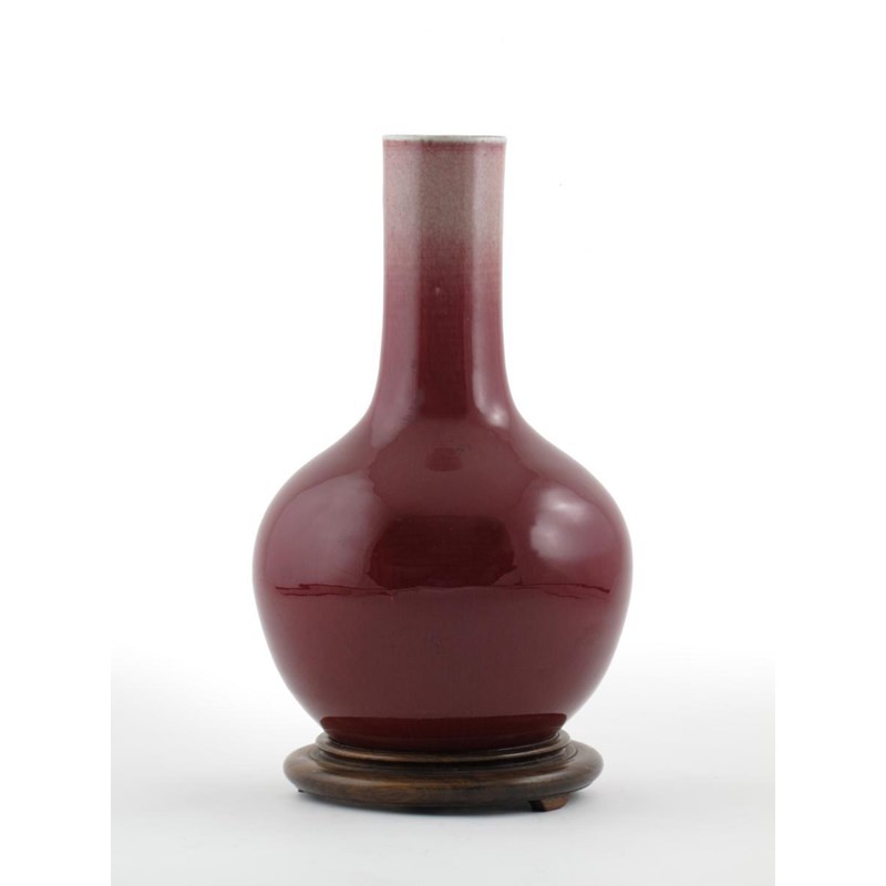 A Chinese bottle vase 19th century, decorated with an even copper-red glaze which drains from the rim, together with a wood stand, 40cm. (2)