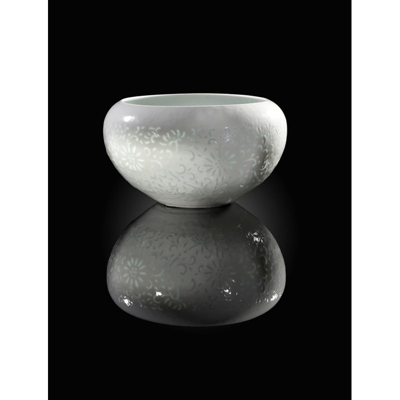 A rare Chinese rice-grain bowl Qianlong 1736-95, with an in-curved rim, decorated with six large flowerheads amidst scrolling foliage and other small flowers, the circular body covered with an even blue-white glaze, the base with five collection labels, 21cm wide.