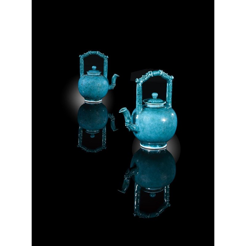 A pair of rare Chinese turquoise glazed teapots and covers Kangxi 1662-1722, each with a gate-form handle, moulded with key fret, 15.5cm. (4)