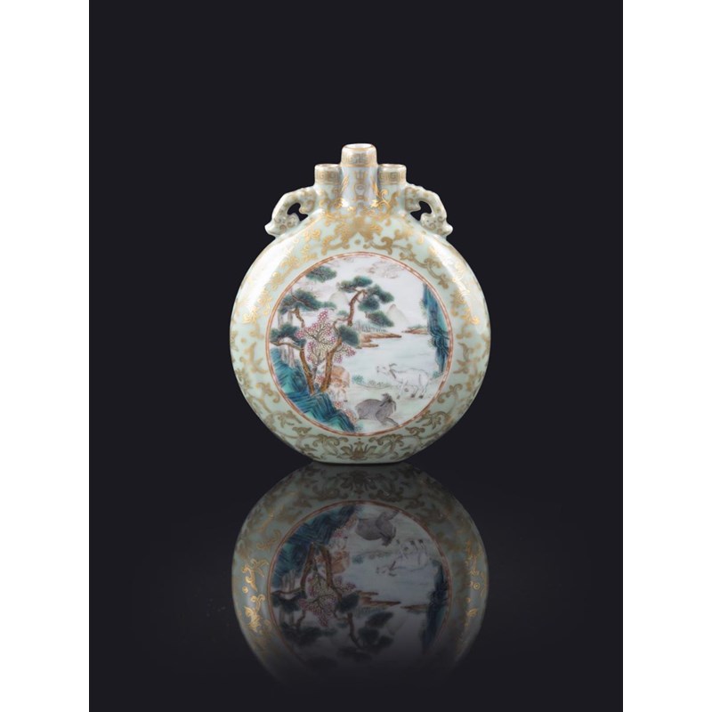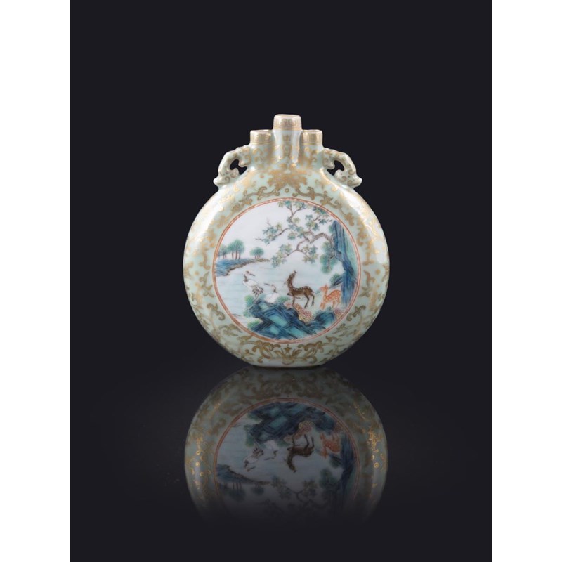 A rare Chinese famille rose triple-necked moonflask four character Qianlong mark in iron red and of the period 1736-95, one side finely enamelled with two deer beside two cranes on rockwork all beneath a maple tree which grows from rocks, the reverse with three goats beneath a pine tree in a lakeside mountainous landscape, the celadon ground decorated with gilt scrolling butterflies, lotus and foliage, some surface scratching and a little restoration, 16cm.