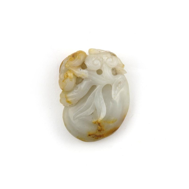 A Chinese pale celadon jade carving of a lingzhi fungus spray, the stone with brown inclusions and with two bats carved in shallow relief, 7cm.