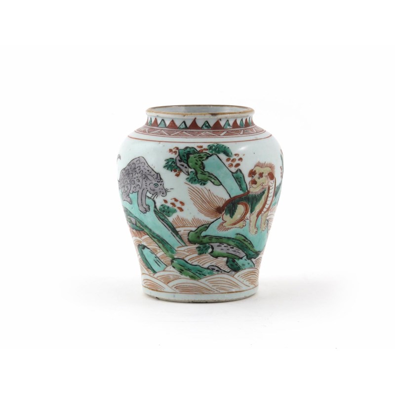 A small Chinese famille verte vase c.1640, painted with a leopard and a lion dog seated on rockwork, a further lion dog swimming amongst waves, 13cm.