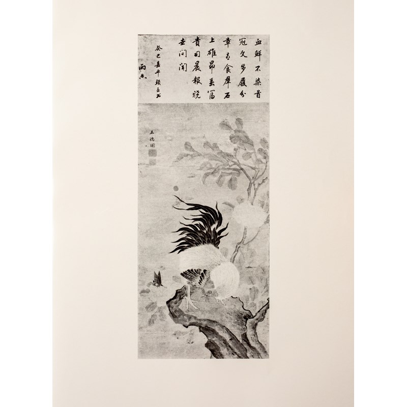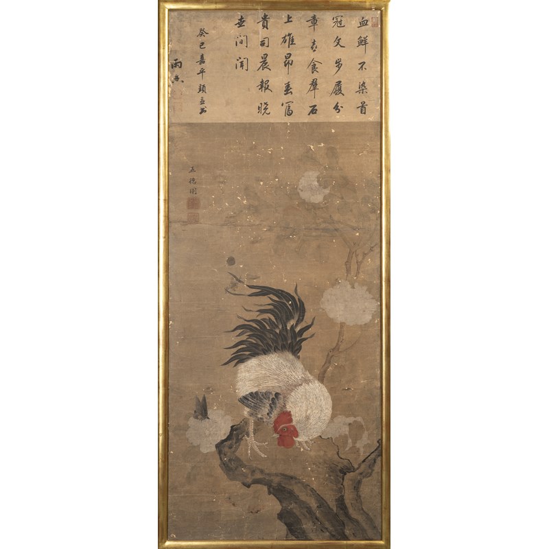 A Chinese painting, ink and colour or paper. A cockerel spies a butterfly as he stands on a rocky outcrop beneath a flowering peony tree. The upper left has two artist’s seals, above is a poem which can be translated as: