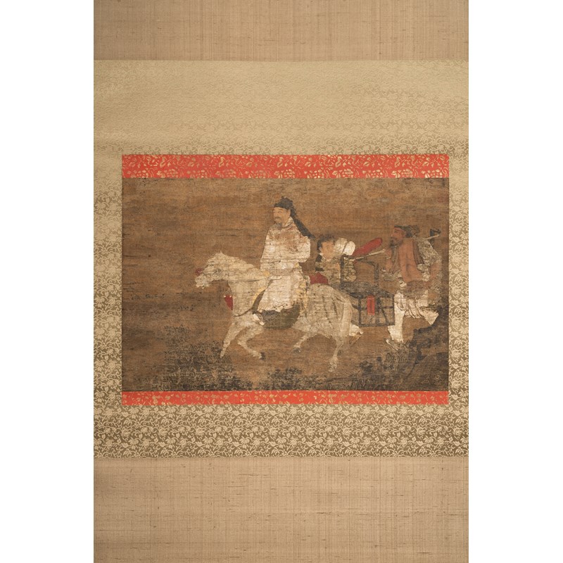 A Chinese painting, ink and colour on silk, depicting a figure on horseback accompanied by two servants, one of whom carries two boxes, with an artist’s seal which reads Zhao Shi Zi Ang (Zhao Mengfu, court painter under the Yuan dynasty), 33cm high, 51cm wide.