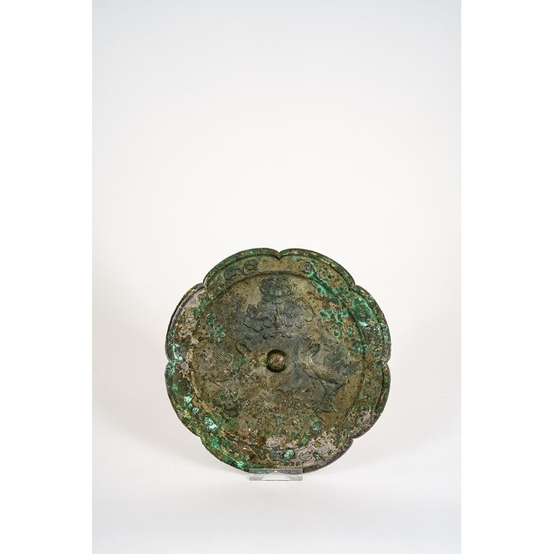 Cast with two cranes and two peonies in relief around a central boss, the lobed rim with eight pairs of leaves, the surface heavily encrusted and corroded, 1.6kg, 24.2cm.