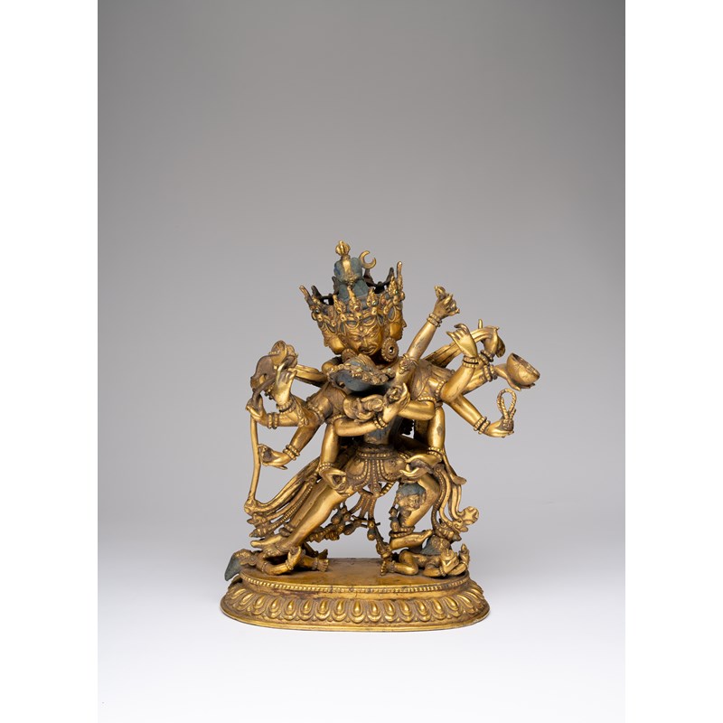Depicting Chakrasamvara standing in yab-yum with his consort Vajravarahi upon a lotus base, with four heads and twelve arms radiating around him, holding a kartika, a kapala and a vajra, both adorned with elaborate beaded jewellery and crowns of skulls, 6kg, 32cm.