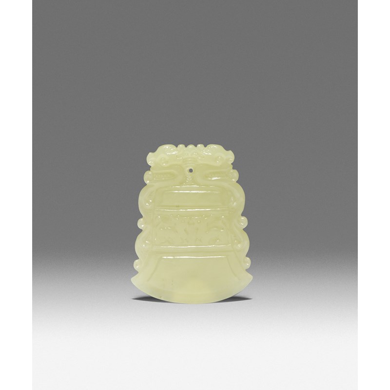 Carved in the shape of a bell, decorated in low relief to each side with a band enclosing a pair of mythical creatures, all flanked by two sinuous archaistic dragons, with a small circular hole for suspension, 5.5cm.