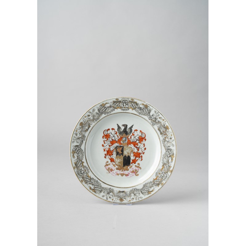 Painted with the arms of Johnson within a border of en grisaille and gilded strapwork, 23.3cm.