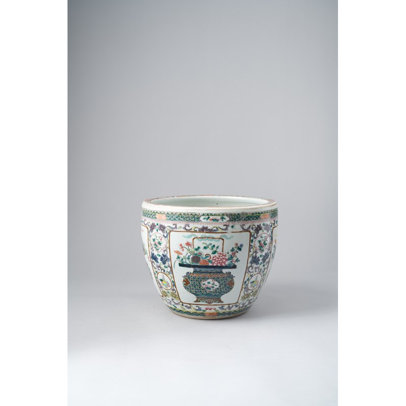 Decorated with panels of vases bearing bouquets of peony, chrysanthemum, lotus and other flowers, alternating with smaller panels of flowers and the 'Hundred Antique's, all reserved on a ground of scrolling flowers below a band of diaper and chevrons, 31.5cm.