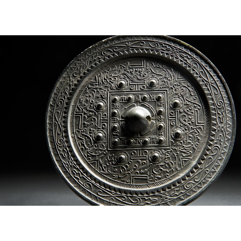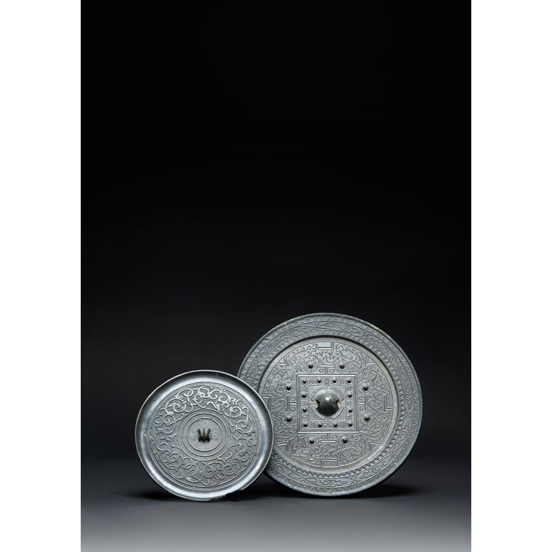 The larger a Twelve Earthy Branches mirror, finely cast with a 'TLV' design and with mythical beasts, the central square band cast with the twelve characters, the large central boss surrounded by smaller studs, the mirror-face with attractive malachite markings, the smaller mirror with an entwined geometric band around the suspension loop, the mirror-face with a paper label for the Cunliffe collection, 645g and 118g, 16.5cm and 11.5cm. (2)