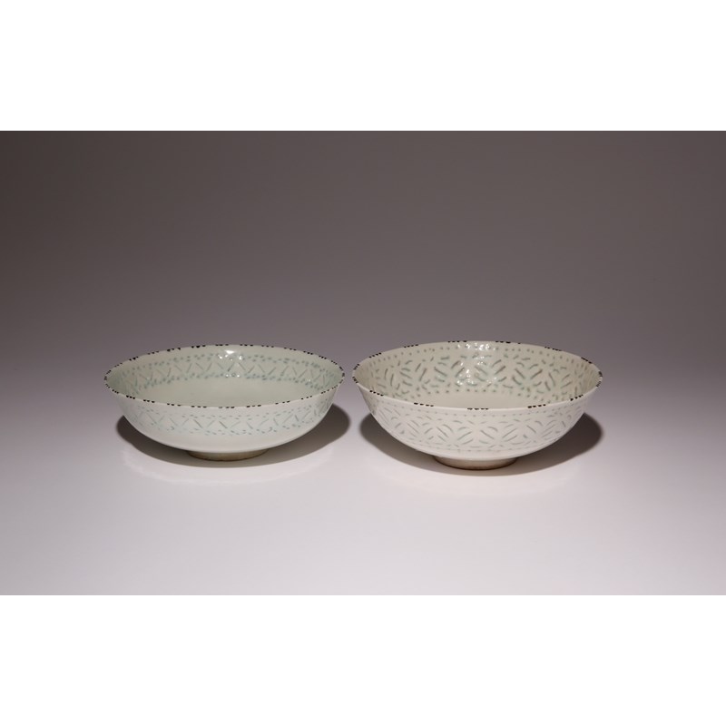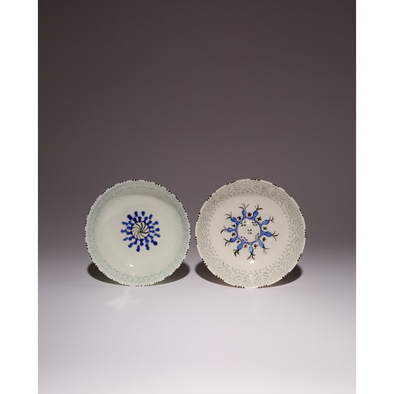 Each with a raised central medallion painted in cobalt blue and black under a transparent glaze, the larger with stars and prongs, the smaller with swirls and petal-shaped flecks, the cavetti decorated with a pierced 'rice-grain' pattern, the rims with a series of black dots, both of shallow rounded form upon a short foot, 18.5cm and 18.2cm. (2)