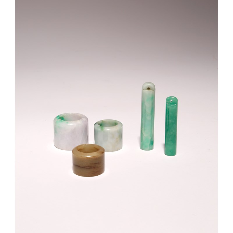 The rings and hat ornaments with apple green and cloudy inclusions, together with a nephrite jade archer's ring, 7cm. (5)