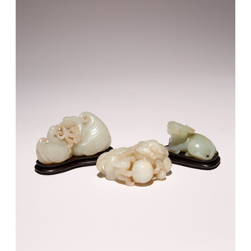 One a pair of geese holding a lingzhi spray, another a lion dog with a small gnome-like figure and a brocade ball, the third a recumbent water buffalo, two with wood stands, 9cm max. (5)