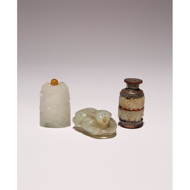 One in white jade, carved as a seal with lotus leaves in relief, another as a crouching boy, the third carved with figures and endless knots, 5.5cm. (3)