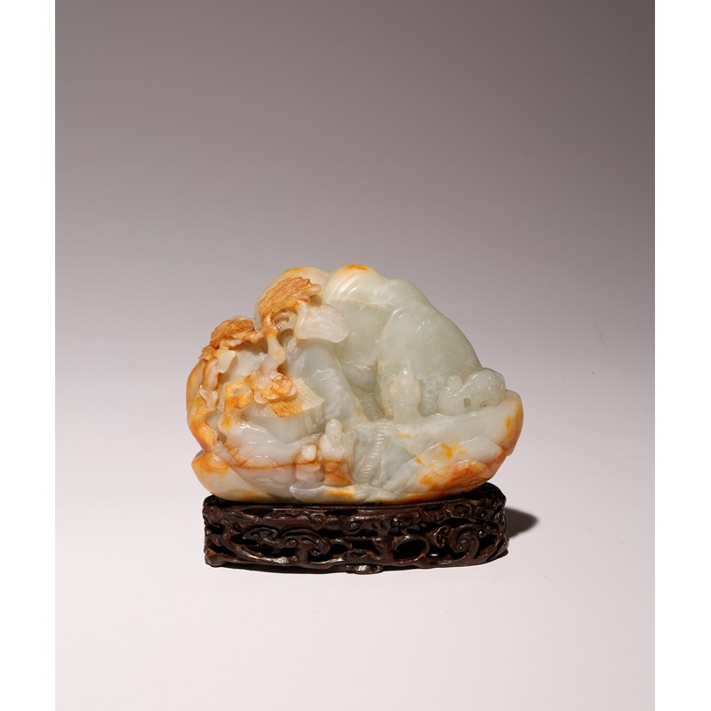 Carved in relief, with figures and a small hut beneath a pine tree, on a mountain ledge, the stone with russet inclusions, with a wood stand, 15.5cm. (2)