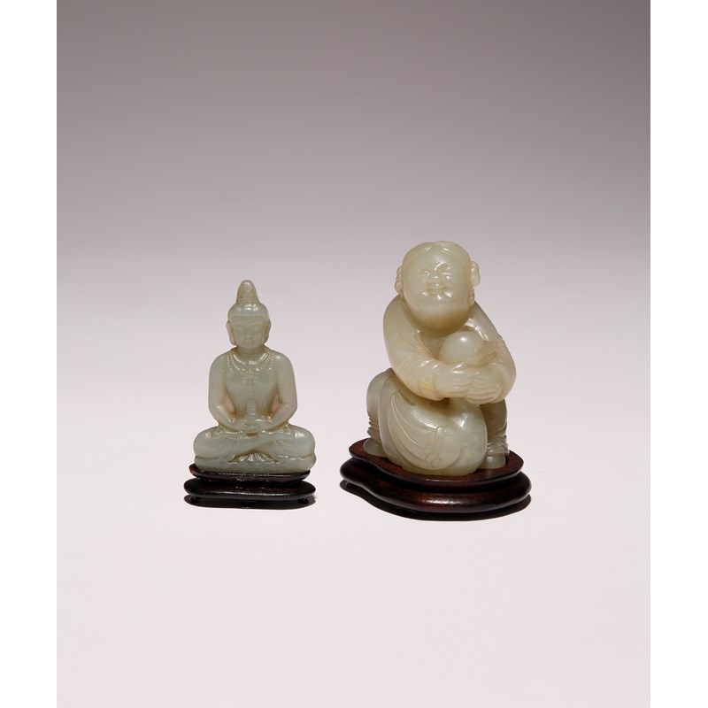 Together with a small celadon jade carving of a seated bodhisattva, with wood stands, 7cm and 6cm. (4)